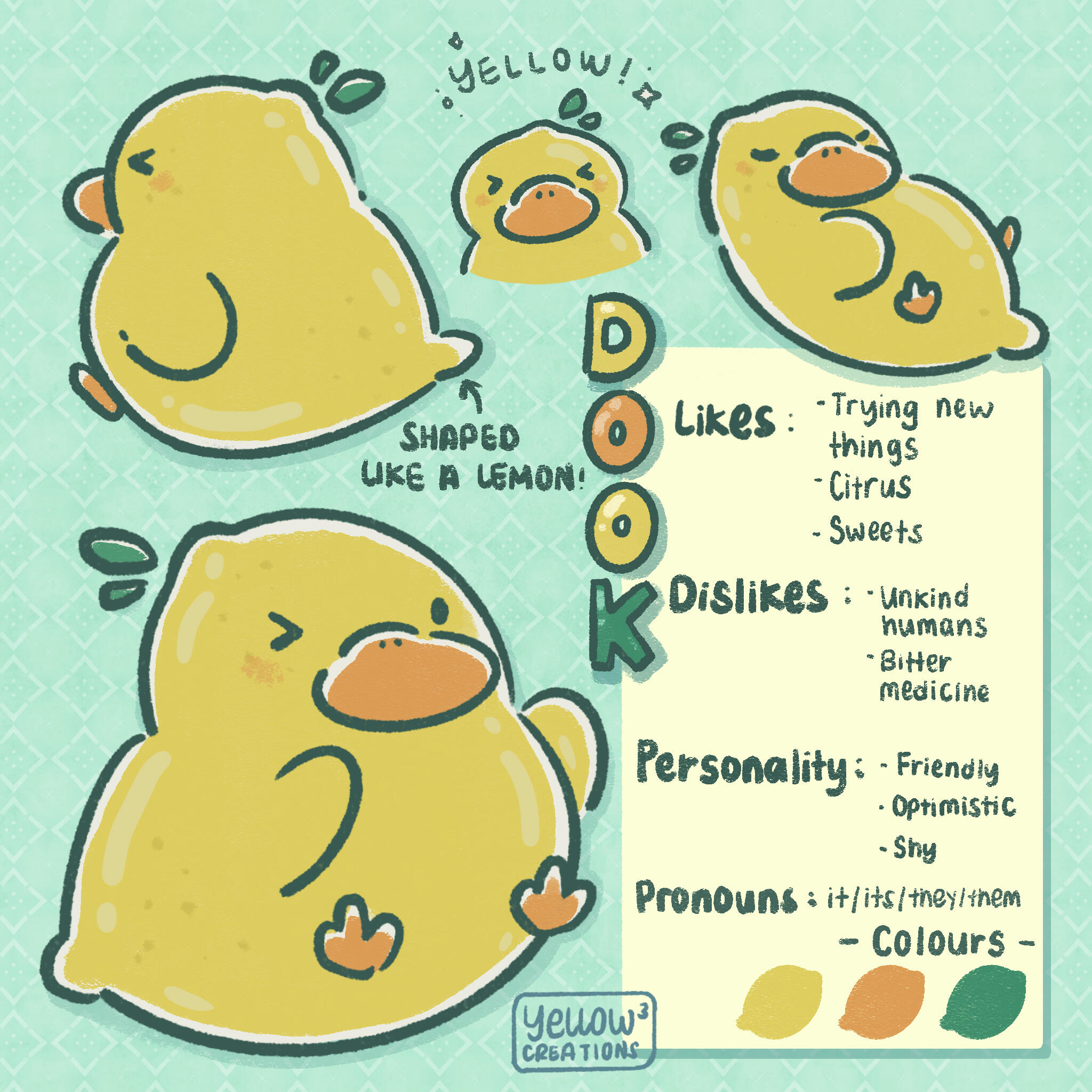 Dook is a curious lemon-shaped duck who enjoys trying new things.They're cheerful and optimistic but is strongly protective of its friends.They enjoy drinking a good cup of tea with baked goods, especially ones that are lemon flavoured.Fun fact about Dook: its ambidextrous! They can write/draw with both hands, but prefer its left hand.